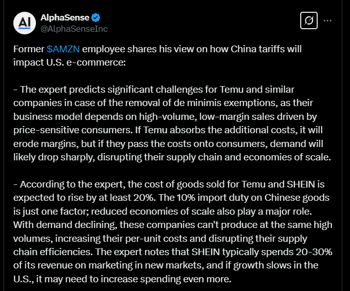 Below is a tweet about how an ex-Amazon employee estimates that tariffs make it difficult for Temu and similar companies to operate, because their business model is based on low prices.