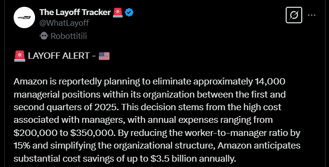 Amazon plans to cut approximately 14,000 management-level jobs in the first and second quarters of 2025. The reason is high salary costs ($200,000–$350,000/year). By reducing the number of managers by 15 percent and simplifying the organization, the company aims for annual savings of $3.5 billion.