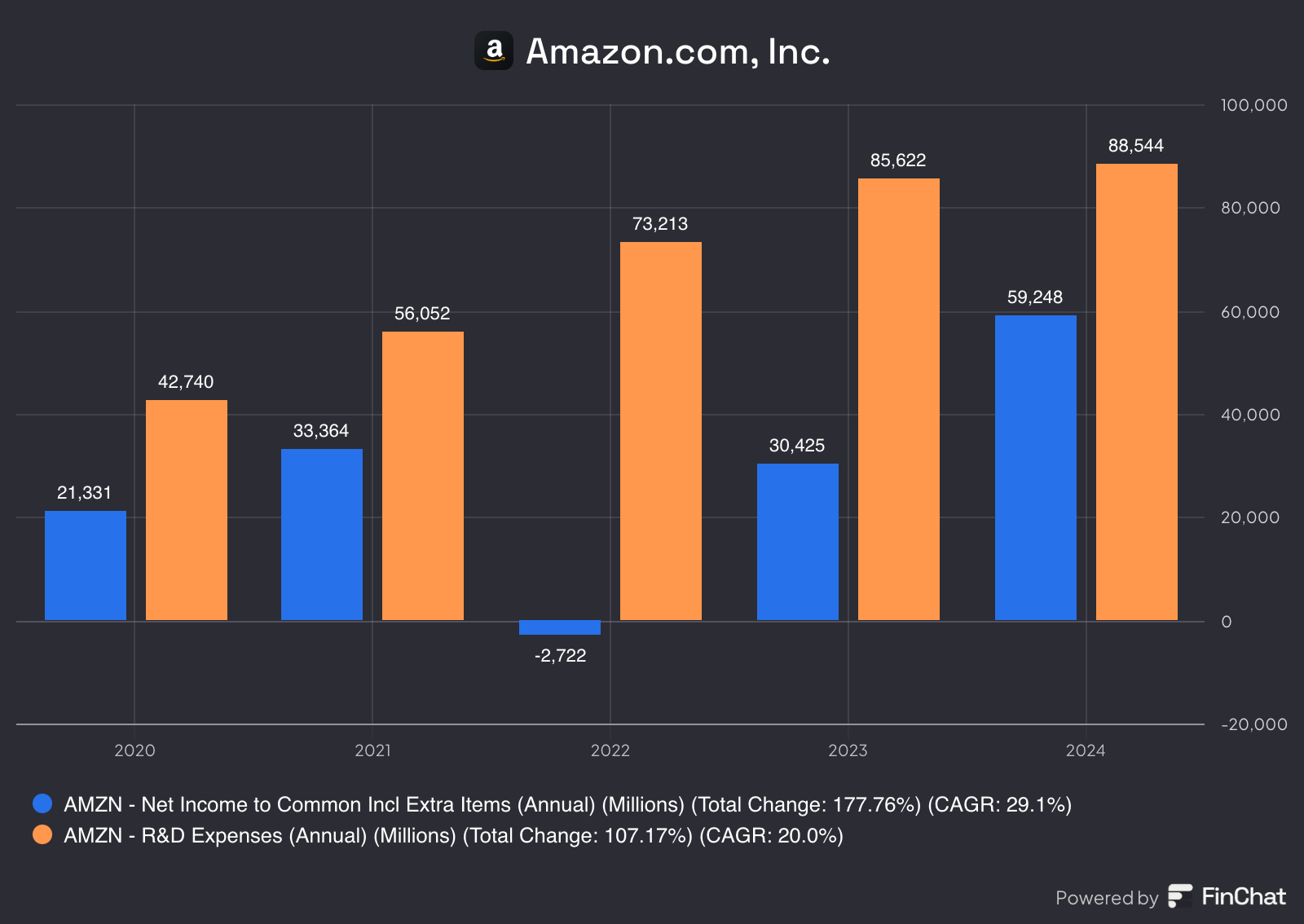 Hmm, I’ve seen things before where Amazon’s large “R&D investments” are discussed, but my understanding is that the quoted figure includes all of the company’s capex, i.e., among other things, the construction of AWS data centers, the construction of e-commerce warehouses, physical stores, etc. I suspect that not all of that is actually R&D. ![]()