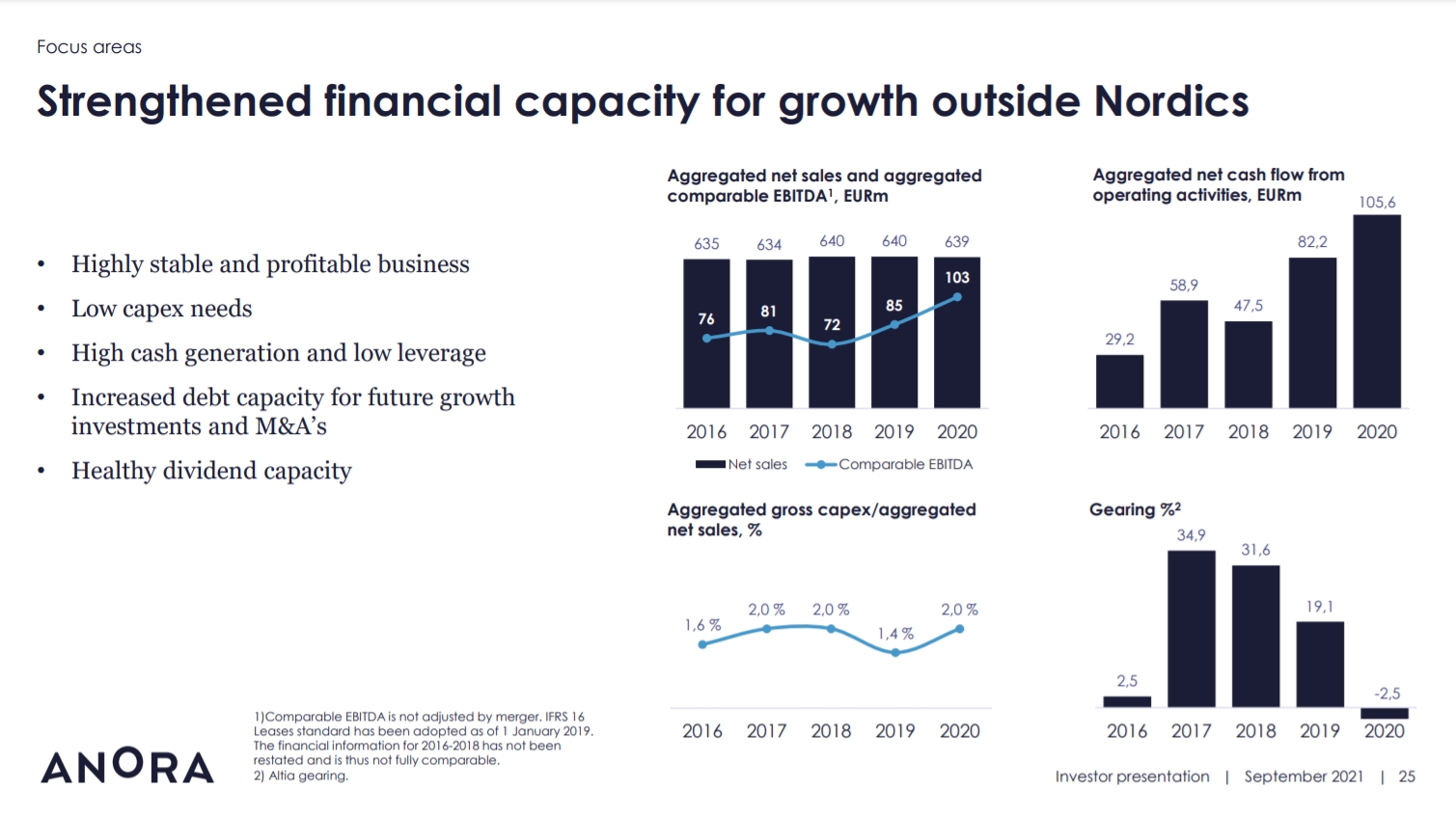 Yhdistynyt Anora saa synergioita oman arvionsa mukaan 8-10m eur EBITDA-tasolla. 2020 yksinkertaisella tavalla yhdistetyt luvut ovat kyllä hyvä ja kannattavuus parantunut vuosi vuodelta. Herää kysymys että voiko tämä enää kauaa jatkua mutta vaikka ei jatkuisi niin eihän tämä kallis ole. Liikevaihto sen sijaan polkee pitkälti paikallaan.