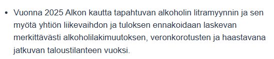 Lisäksi Alko julkisti tänään viime vuoden tuloksen ja samalla alla olevan näkymän tälle vuodelle. “merkittävä” lasku kuulostaa heikolta verrattuna Anoran odotuksiiin Pohjoismaisella tasolla tasaisista volyymeistä. Toki Alkon myyntiä painaa etenkin H1:llä viime kesäkuussa tehty 8 % viinien lakimuutos ja sen tuoma Alkon myynnin lasku niin viineissä kuin väkevissä.