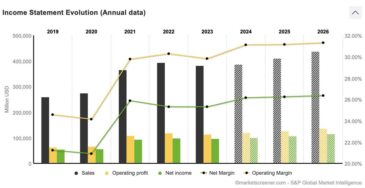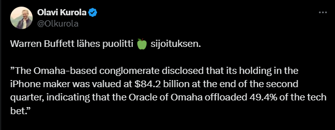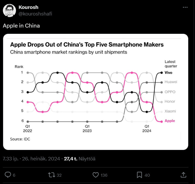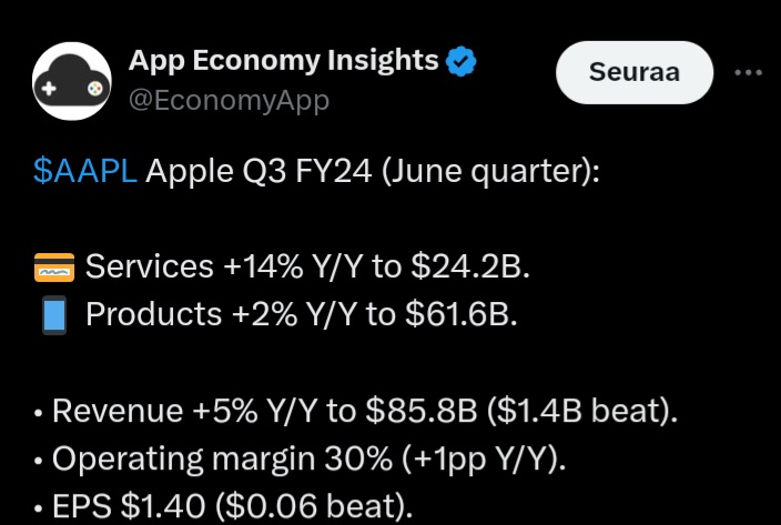 Apple majailee markkina-arvolla mitattuna maailman toiseksi arvokkaimpana yhtiönä Microsoftin vanavedessä, mutta enää vain niukasti Nvidian edellä 2 913 miljardin dollarin markkina-arvollaan. Kasvuvauhti on myös analyytikoiden ennusteiden perusteella hidastumaan päin ja vaikka kannattavuuden odotetaan hieman paranevan edellisestä vuodesta, huitelee arvostus silti kasvuodotuksiin nähden melko korkealla. Nähtäväksi jää pystyykö Apple vielä kiihdyttämään kasvuaan vai onko yhtiö saavuttanut huippunsa, josta on enää vaikea kasvaa markkinaa nopeammin.