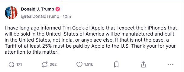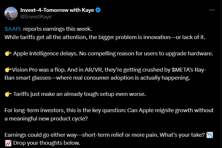 According to the tweeter, a bigger concern than tariffs is the company’s lack of innovation, e.g., Apple Intelligence is delayed, new devices do not entice upgrades, and Vision Pro failed.