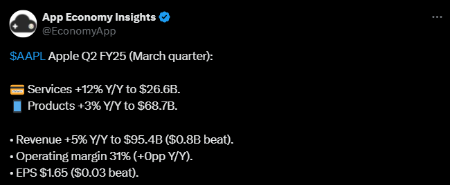 Apple reported strong Q1 results; operating profit and earnings per share grew. The Services business achieved double-digit growth, and iPhone revenues remained at a high level. The company also unveiled new Macs and iPads, as well as the iPhone 16e.