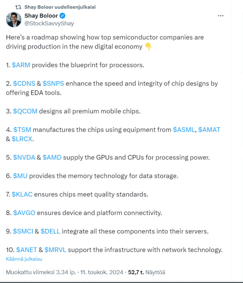 A writer on X has gone to the trouble of mapping out the roles of semiconductor companies across the entire production chain. Not a bad breakdown, in my opinion. Anyone can use this as a framework for their own perspective.