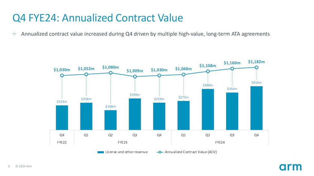 Arm states that Arm9 is built more intelligently from a royalty perspective than previous architectures. That is, Arm9, in my estimation, generates license fees, annual contract value (ACV), and royalties reflecting cash flow from the end-user side.