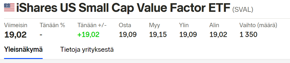 Tuohon Small cap value etf:ään liittyen, smalla capit ovat muutenkin jääneet tänä vuonna jälkeen. Jos/kun talous paranee luulisi niidenkin inahtavan liikkeelle.
