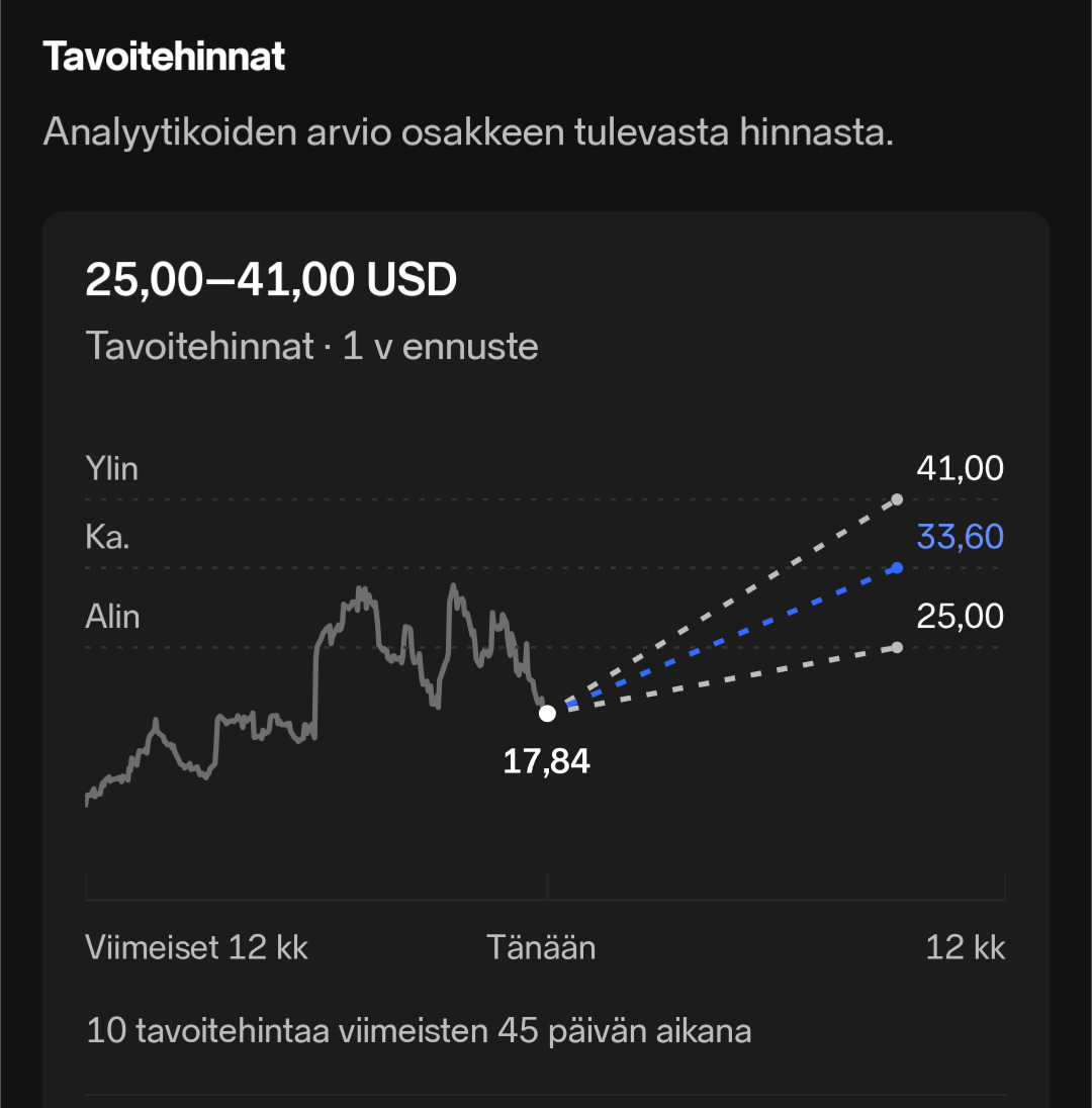 Osakkeen valuaatio on heitellyt todella paljon, nyt menty alamäkeä. Tukitasoa pitäisi löytyä näiltä paikkeilta, mutta hyvin volatiili tapaus kyseessä. Kuva tammi-lokakuu 2024 ajalta.