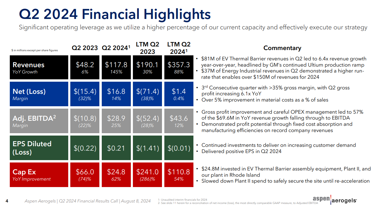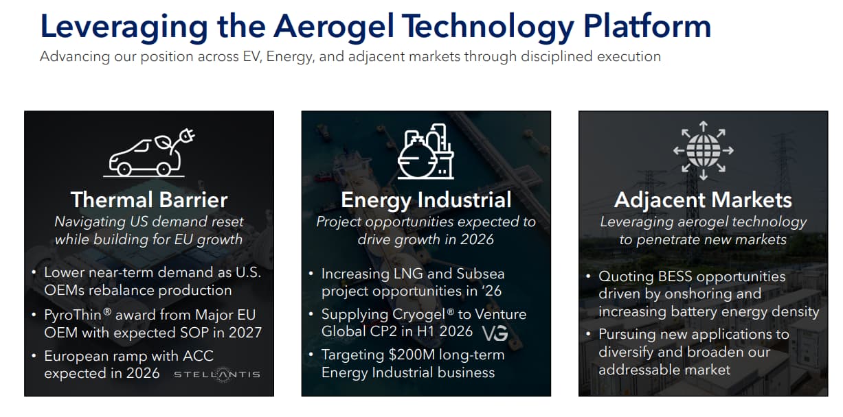 Yhtiö panostaa myös nopeasti kasvavaan sähköautomarkkinaan. Sen aerogeelipohjaisia ratkaisuja käytetään sähköautojen akkujen lämmönhallintaan, mikä parantaa akkujen turvallisuutta ja kestävyyttä. Näin Aspen Aerogels pystyy vastaamaan autoalan tarpeisiin, sillä sähköautojen valmistajat pyrkivät parantamaan akkuturvallisuutta ja ajomatkaa.