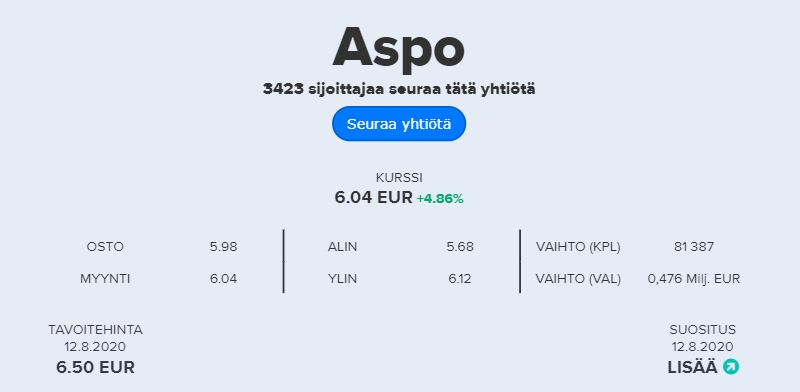 Tavoitteisiin ei ole viime aikoina päästy ja johtokin on vaihtumassa, mutta yritän holdailla vähintään osaa halvalla saaduista Aspoista. Yhtiössä on tehty parissa vuodessa oikein hyviäkin liikkeitä.