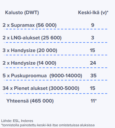 ”Laajalti seurattu Baltic Dry-indeksin antaa globaalin rahtimarkkinan kehityksestä kokonaiskuvan. Aspon sijoittajan kannalta se ei kuitenkaan ole kovin relevantti, sillä ESL:n kalustoa selvästi isompien valtamerialusten (Capesize) painoarvo siinä on suuri. ESL tekee myös asiakkaidensa kanssa tyypillisesti pitkiä sopimuksia, jotka pehmentävät rahtihintojen muutosten vaikutusta yhtiön kannattavuuteen (pl. Supramax-alukset).”