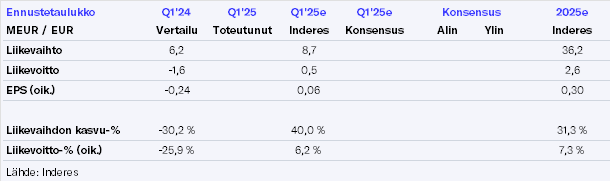 We expect the company to perform similarly in Q2 as in Q1, which means very strong revenue growth (+48%) and a significant improvement in results from the previous year. Aspocomp’s turnaround progressed excellently in the early part of the year, but it apparently faces capacity constraints. We expect the demand situation to have remained very good in the semiconductor industry and the defense sector. Overall, the outlook should remain positive for 2025, through which we pay special attention to management’s actions to increase capacity. We assume the financial situation has remained relatively tight as growth ties up working capital, but still under control.