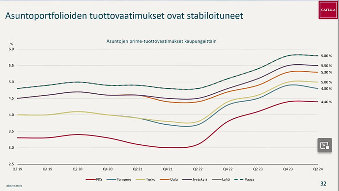 OP-Vuokratuotto’s 2023 annual report states that the market’s required rate of return increased by 1-2% during the year, but no corresponding write-downs were made to the fund’s valuations. Now the fund’s residential property portfolio yield is somewhere around 3 - 3.5%, and they refuse to realize their holdings at too low a price. However, they had no qualms about recording revaluations in the portfolio when the market’s required rate of return decreased during the zero-interest rate period.