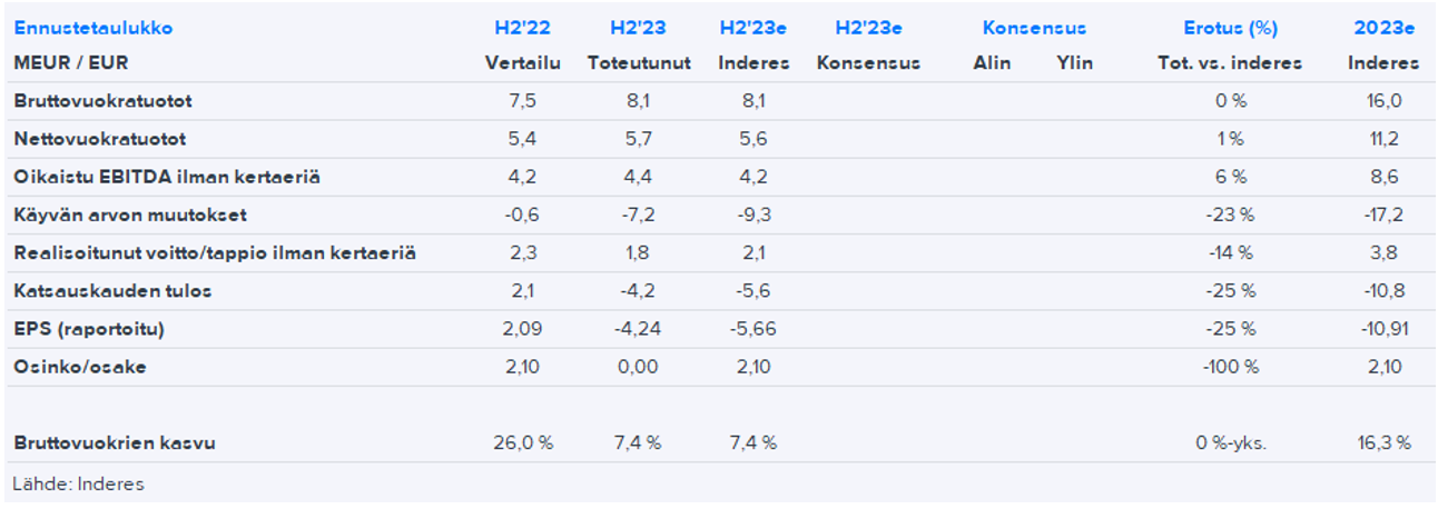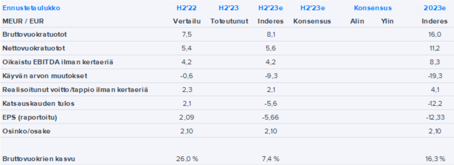 Asuntosalkku julkaisi aamulla odotuksiamme heikomman H2’23-raportin (ajanjakso 1.4.2023-30.9.2023) ennakoimaamme korkeampien rahoituskulujen takia. Muuten operatiivisesti raportti oli linjassa/hieman odotuksiamme vahvempi. Suomen portfolion käyvät arvot laskivat sen sijaan odotuksiamme vähemmän, mikä oli positiivista. Yhtiön liikevaihto-ohjeistus oli odotuksiamme vahvempi, mikä selittyy Viron tytäryhtiön 14 kuukauden tilikaudella ensi vuonna. Asuntosalkku ehdottaa, että tilikaudelta ei makseta osinkoa, mikä ei ollut enää yllätys hiljattaisen osinkopolitiikan muutoksen jälkeen. Yhtiön Q3-webcastia voi seurata täällä.