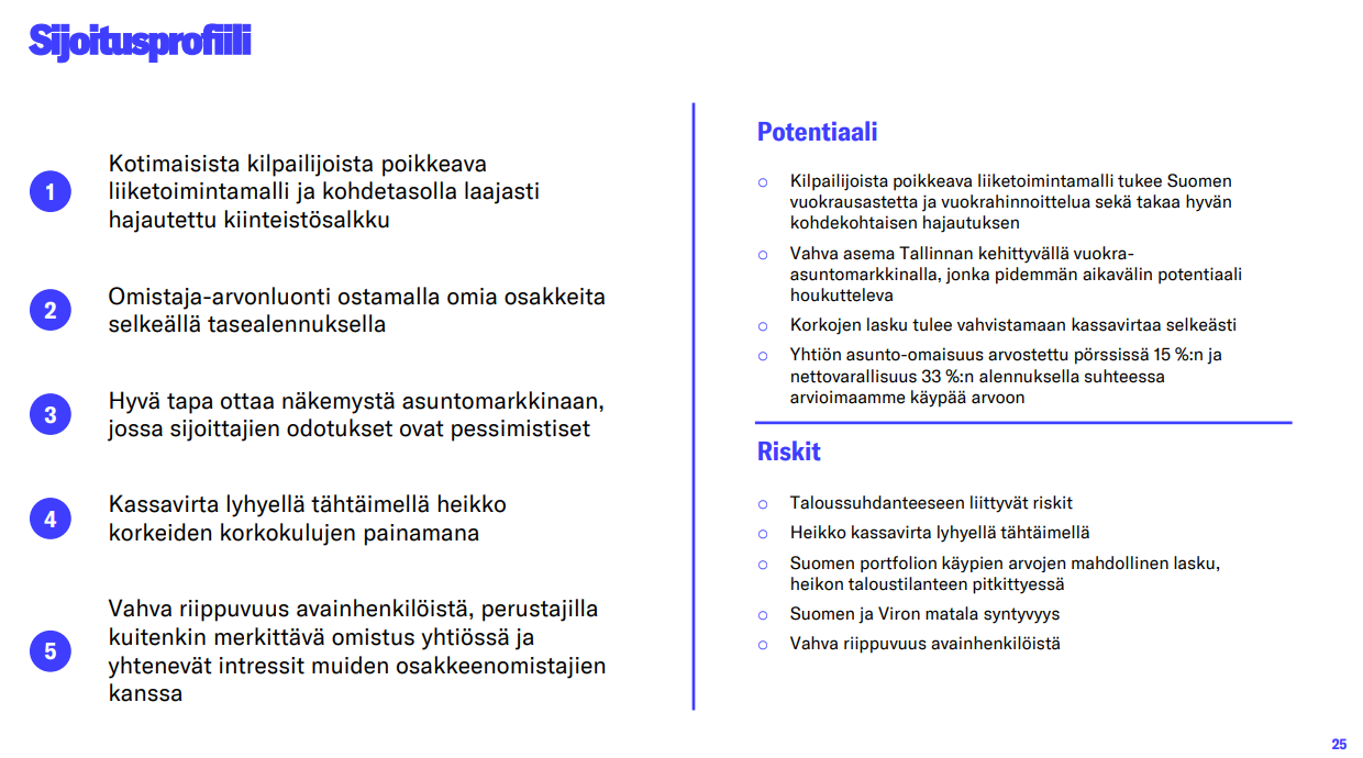 Asuntosalkku toimii kilpailijoista poikkeavalla strategialla, joka nojaa yksittäisiin asuntoihin hyvillä sijainneilla ja yhtiön kautta pääsee osaksi kehittyvän Tallinnan vuokra-asuntomarkkinan potentiaalia. Strategian keskiössä on omistaja-arvon maksimointi, mikä tarkoittaa lyhyellä aikavälillä Tallinnassa asuntomyyntejä yli tasearvojen ja omien osakkeiden ostoja tasealennuksella. Korkojen nousu iski voimalla yhtiön kassavirtaan, mutta nyt nähty lasku tarjoaa selvää tukea kassavirralle jo ensi vuonna. Kassavirtapohjaisesti arvostus on kireä, mutta tasepohjaisesti taas hyvin houkutteleva (P/NAV 2025e 0,67x), jonka takia toistamme lisää-suosituksemme. Nostamme tavoitehintamme 92 euroon (aik. 88 €), koska näemme ajoituksen olevan houkutteleva ottaa näkemystä asuntomarkkinaan.
