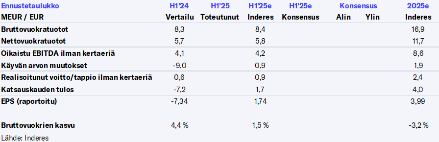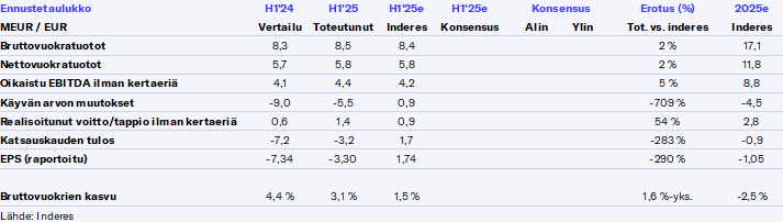 Asuntosalkun H1’25-rapotti (ajanjakso 1.10.2024-31.3.2025) oli kokonaisuutena operatiivisesti melko odotettu. Nettotuotot ja oikaistu käyttökate kasvoivat hieman vertailukaudesta. Käyvät arvot jatkoivat kuitenkin vastoin odotuksiamme laskusuunnassa, vaikka tuottovaatimukset pysyivät ennallaan. Laskua tuli erityisesti Suomessa, jossa vuokratasot kääntyivät pieneen laskuun. Näin ollen EPS painui edelleen tappiolliseksi. Korkojen lasku näkyi lainojen keskikoron laskuna, mikä näkyy vahvemmin tuloksessa H2:lla. Yhtiö on kyennyt jatkamaan Tallinnan asuntomyyntejä selvästi yli arvonmääritystasojen, ja myynnit antavat mielestämme jo kohtuullisesti evidenssiä Tallinnan asuntojen aliarvotuksesta.