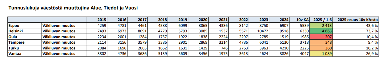 Omasta mielestäni erittäin mielenkiintoinen muutostrendi on yllättäen jatkunut: Suurista kaupungeista Tampere, Turku ja Oulu hyytyvät muuttovoiton osalta. Ja vastaavasti pääkaupunkiseutu jatkaa hyvässä vauhdissa.