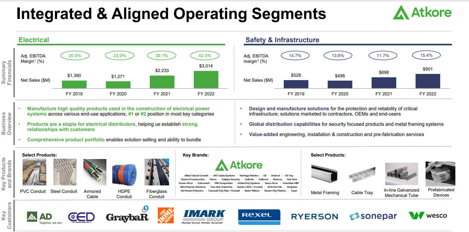 Atkore (NYSE: ATKR) on pääosin Yhdysvalloissa toimiva keskisuuri teollisuusyritys, jonka markkina-arvo on tällä hetkellä noin 5000 MUSD, liikevaihto oli juuri päättyneellä tilikaudella 3418 MUSD ja nettotulos 690 MUSD. Yhtiö harjoittaa sähkö-, turvallisuus- ja infrastruktuurituotteiden valmistusta ja myyntiä Yhdysvalloissa ja kansainvälisesti. Yritys tarjoaa putkia, kaapeleita ja asennustarvikkeita (Electrical -segmentti) ja lisäksi myös metallikehyksiä, mekaanista putkea, ympäristönsuojausta ja kaapelinhallinnan tuotteita (Safety & Infrastructure -segmentti). Alla hyvä yhteenveto 2022 esitysmateriaaleista.
