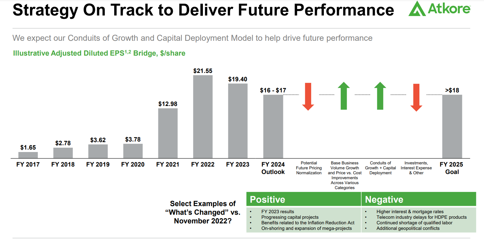 Tästä dynaamisesta hinnoittelusta päästään siihen, että joskus 2021 alkukesällä yhtiö nosti PVC-tuotteidensa hintoja satoja prosentteja, mikä johti yhtiön marginaalien räjähtämiseen. Tämä varsin dramaattinen liike teki ehkä myös näkyväksi yhtiön vahvan kilpailuaseman ja ehkä moni sijoittajat ”löysi” yhtiön tällöin (ainakin minä). Hintojen noston taustalla oli erittäin vahva kysyntä, Yhdysvaltojen rakennussektorin herääminen koronahorroksesta ja samanaikainen tarjonnan supistuminen, joka johtui samanaikaisesta polymeerituottajien tuomitusvaikeuksista. Kilpailijoiden toimitusajat venyivät viikosta kahdeksaan viikkoon, ja lopulta he eivät pystyneet ottamaan enää uusia tilauksia ollenkaan. Tässä pitää myös tietää, että usein uusissa rakennuskohteissa voimalinjat vedetään sinne maahan PVC-putkissa aivan projektin alussa ja koko projekti seisoo, jos niitä putkia ei ole saatavilla. Atkorella ei ollut ikinä näitä kilpailijoita vaivaavia toimitusongelmia, mikä ehkä kertoo yhtiön operatiivisesta suorittamisesta, ja se pystyikin toimittamaan urakoitsijoille niiden kipeästi tarvitsevat tuotteet ajallaan, kunhan hinnasta sovittiin. Vaikka silloisessa keskustelussa keskityttiin aika paljon PVC:hen sen ollessa Atkoren suurin tuotesegmentti, niin myöhemmin, kun inflaatio lähti laukalle, niin yhtiö kyllä nosti kaikkien muidenkin tuotteidensa hintoja reippaasti tehokkaan hinnoittelumallinsa puitteissa. Kokonaisuudessaan yhtiö sai tästä noin miljardi dollaria ”ylimääräistä” käyttökatetta, mekanistisesti laskien aiemmasta vuosittaisesta tulostasosta. Ongelma tässä oli vaan että se miljardin ylimäärä näytti vain säilyvän kvartaalista toiseen, koko 2022 tilikauden ja 2023 tilikaudellakin käyttökate laski vain -250 MUSD. Yhtiön sisäinen tavoite onkin ollut tietenkin säilyttää mahdollisimman paljon tästä hinnottelusta, ja oikeastaan yhtiön filosofia on ollut jo vuodesta 2010 lähtien luoda asiakkaalle jotain arvoa, mikä perustelee kestävän hintapreemion suhteessa kilpailijoiden tuotteisiin, eikä niinkään mikään kiskurihinnoittelu. Yhtiön johdolla on ollut nyt pari vuotta aikaa analysoida tätä poikkeustilannetta ja heidän lopputuloksensa ja ohjeistus on se, että tästä ”yliansaitsemisesta” 40 % eli 400 miljoonaa on lopulta kestävää yhtiön kilpailuetujen myötä, mikä muodostaa pohjan yhtiön ohjeistukselle tulevasta 25 % käyttökatemarginaalista.