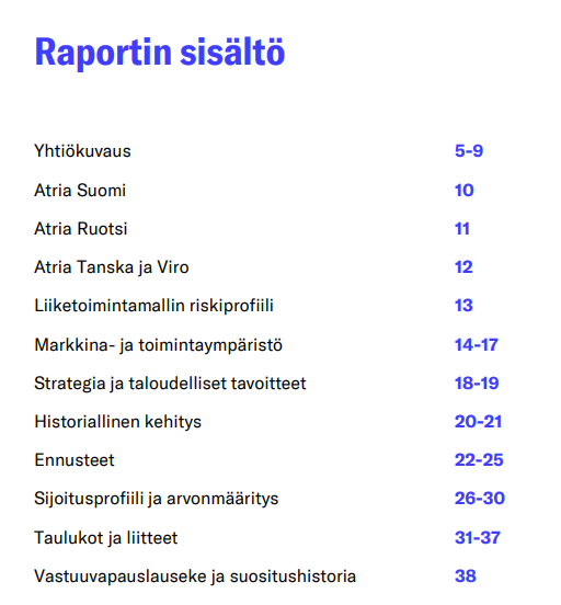 Atria on sijoituskohteena selkeä osinkopaperi. Samalla johto kehittää yhtiötä aktiivisesti ja hakee kasvua eri osa-alueilta. Kun myös velka supistuu, se luo mahdollisuuksia sekä voitonjakoon että uuden, valmisteilla olevan strategian mukaisiin investointeihin tulevina vuosina.