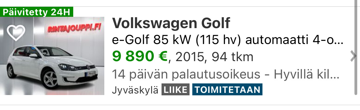 ICE car prices have also halved in a couple of years, at least as far back as the last decade. Over the last 15 years, I’ve bought several two-year-old diesels for about half the price of a new one. With Finnish plates, at half the Finnish price. For tax-free EVs, the Central European price level is more clearly reflected for the Finnish buyer.