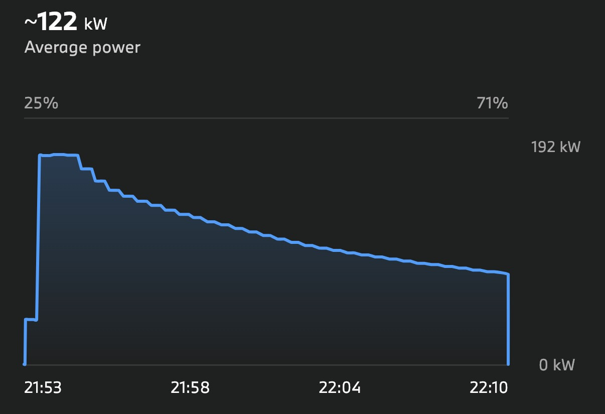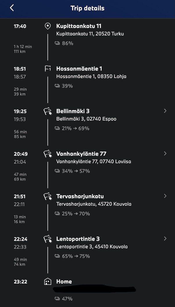 The third stop took place at the Veturi yard, which had become familiar from the outbound journey. During a 20-minute stop, the battery charged 25% → 70%, average charging speed 122 kW. Peak charging speed 192 kW between 25% - 35%. I really wouldn’t have needed to charge nearly that long.