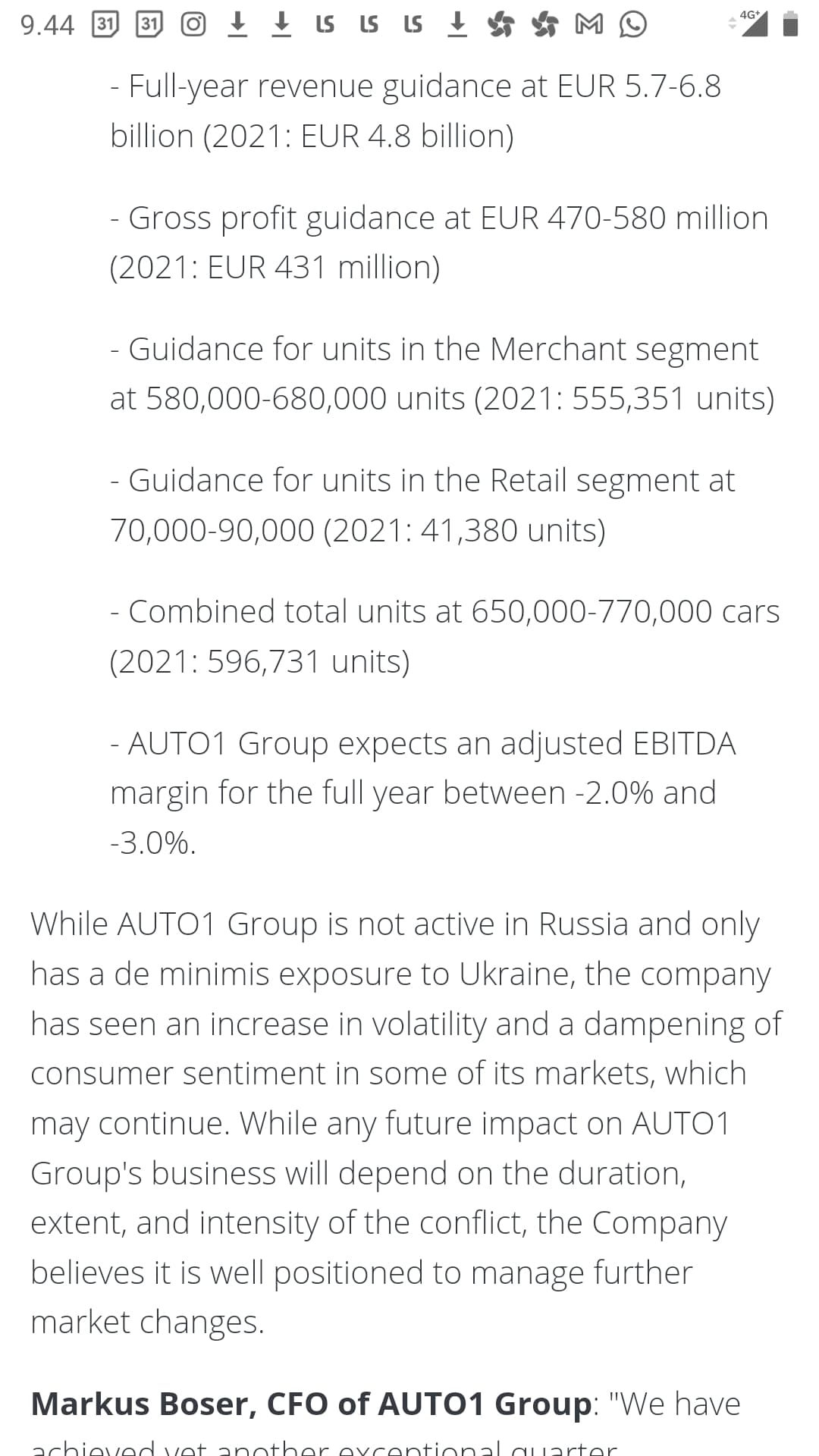 FY 2021 liikevaihto ohjaus on 4,5 -4,6 Miljardia euroa. Yhtiä tekee tappiota ja sillä on mm. Softbank rahoittajana ja omistajana, joten oletan sen olevan kasvukone vielä jonkin aikaa. Yhtiön oma tavoite on olla Euroopan suurin ja kannattavin käytettyjen autojen myyjä.