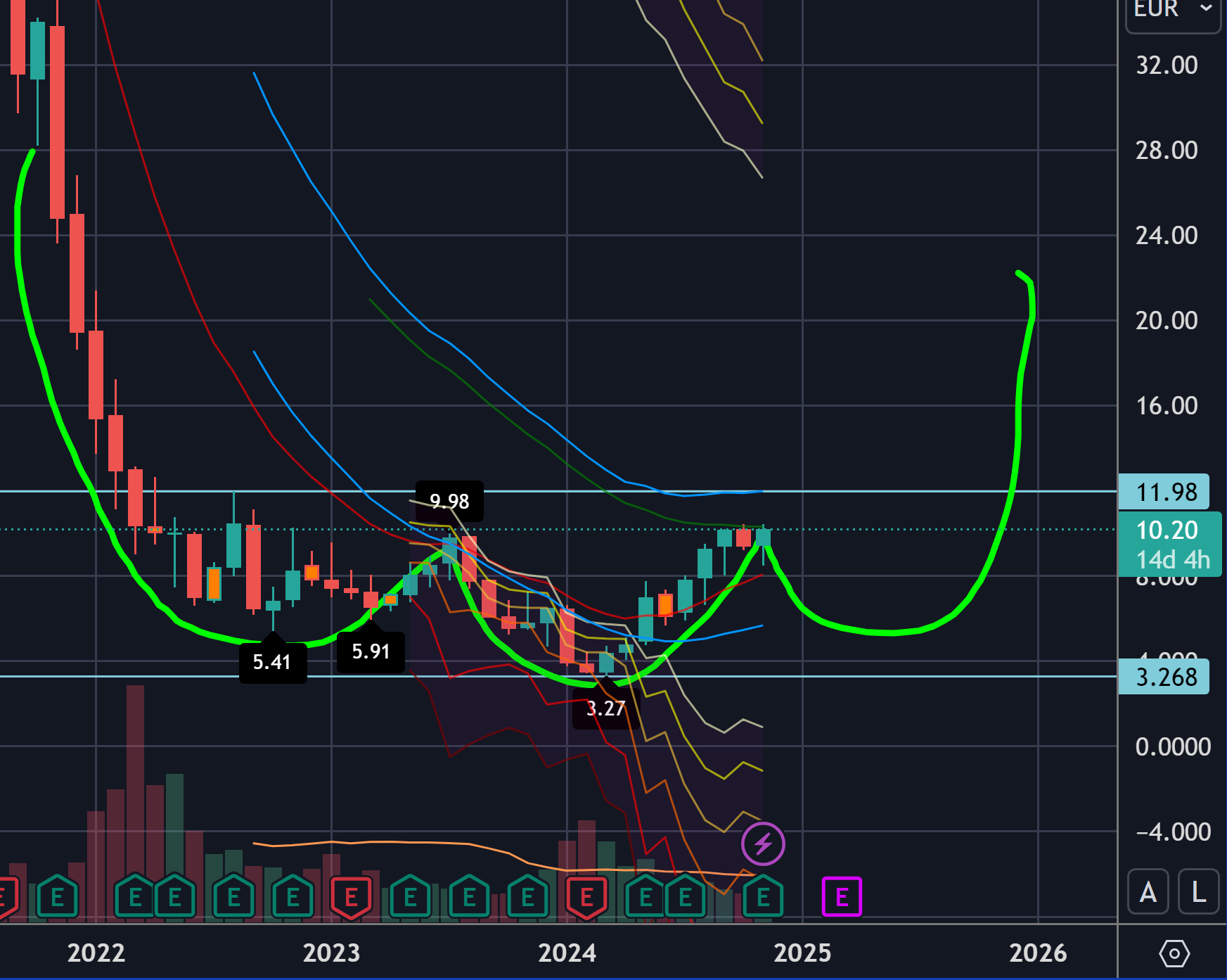 Olen ainakin itse erittäin härkäinen yhtiön tulevaisuuden suhteen osittain juuri @DayTraderXL:n mainitsemista syistä. Ellei se alkanut juuri tänään, odotan seuraavan kunnon nousuputken alkavan viimeistään 2025-Q1 jälkeen. Pitäisin itse asiassa jopa parempana, jos nyt mentäisiin suurin piirtein vaakaliitoa vuoden loppuun, jotta odotukset eivät kurssinousun myötä nousisi liikaa ennen Q4:lle ennustettua heikompaa kvartaalia. Jos markkina ei täysin sula alta, odotan kurssin olevan 2025 lopulla ihan eri lukemissa.