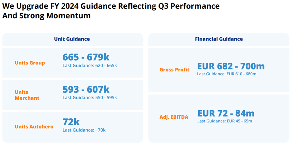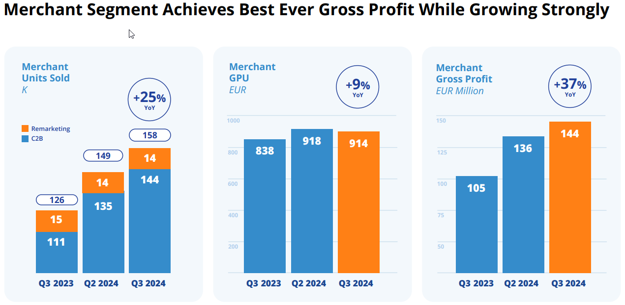 Tällä hetkellä luvataan Merchantin osalta vain tuota 5-9 % (oletettavasti QoQ-) kasvua, koska ensi vuodelle ei odoteta merkittävää markkinan kasvua. Kasvu pitää siis hakea muiden kustannuksella. Makroympäristö ei tällä hetkellä ole Euroopassa paras mahdollinen. Tämä ei kuitenkaan ole vielä päässyt vaikuttamaan negatiivisesti yhtiön toimintaan. Käytettyjen autojen markkina kasvaa tällä hetkellä noin 6-8 % vuodessa, mutta Auto1:n kasvu on tätä nopeampaa. Käytännössä uskovat pystyvänsä kasvamaan markkinaa nopeammin myös ensi vuonna syömällä markkinaa muilta.
