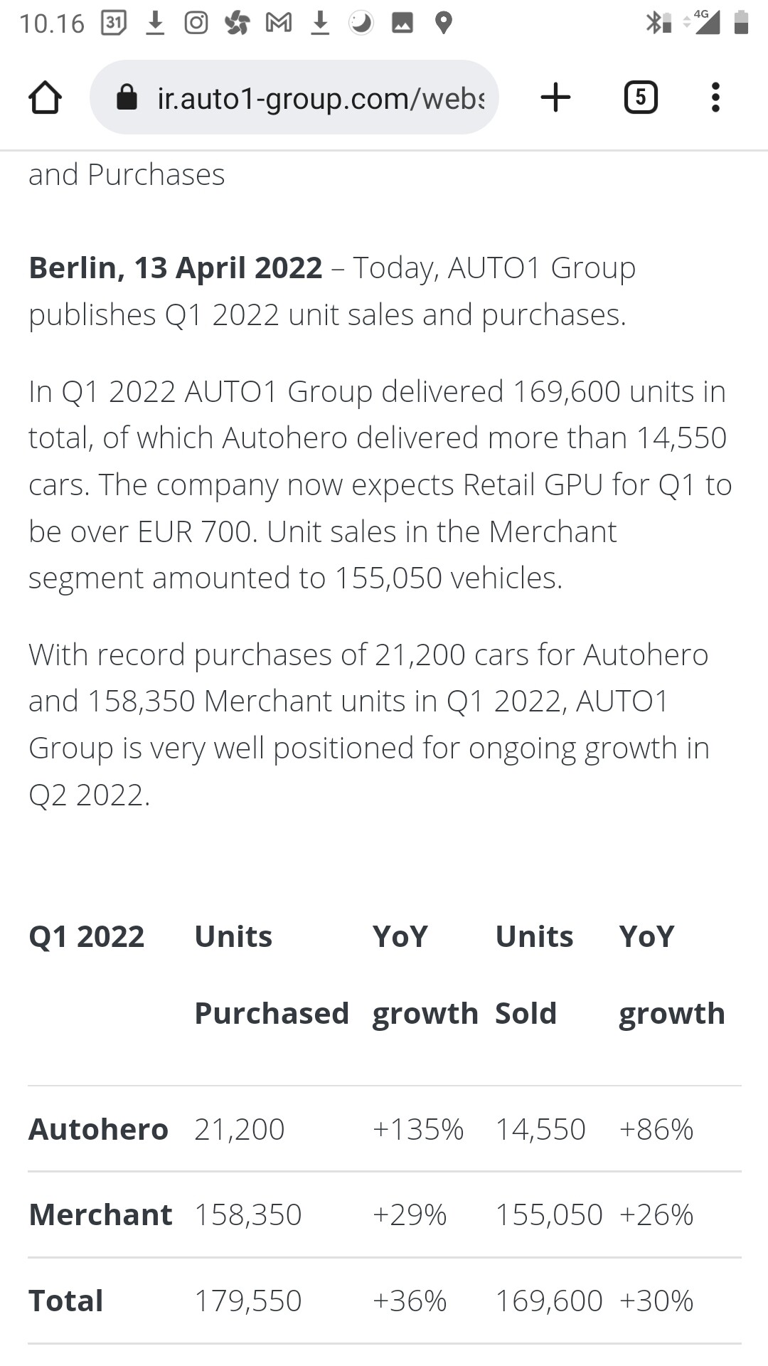 AUTO1 Group voksede 37% mere end brugtbilsmarkedet, hvilket demonstrerer styrken af sin platform og dens evne til at tage markedsandele. Koncernen øgede antallet af solgte biler til 166.147 (Q2 2021: 142.715) og øgede omsætningen med 63,1% år-til-år til EUR 1,74 milliarder (Q2 2021: EUR 1,07 milliarder), med en bruttofortjeneste op 27,3% år-til-år til EUR 126,4 millioner (Q2 2021: EUR 99,3 millioner).