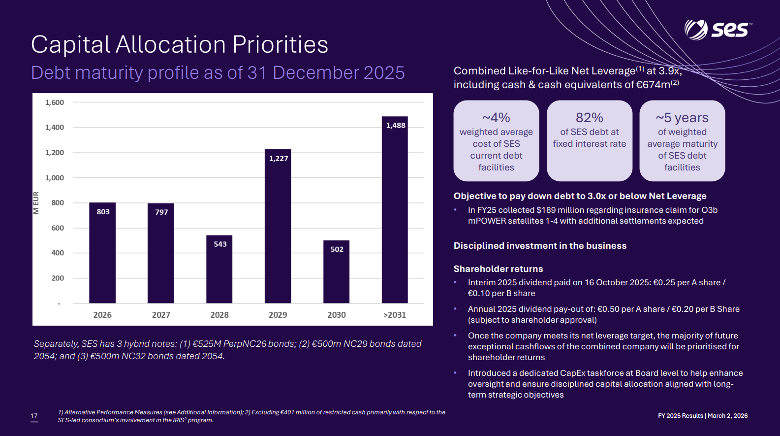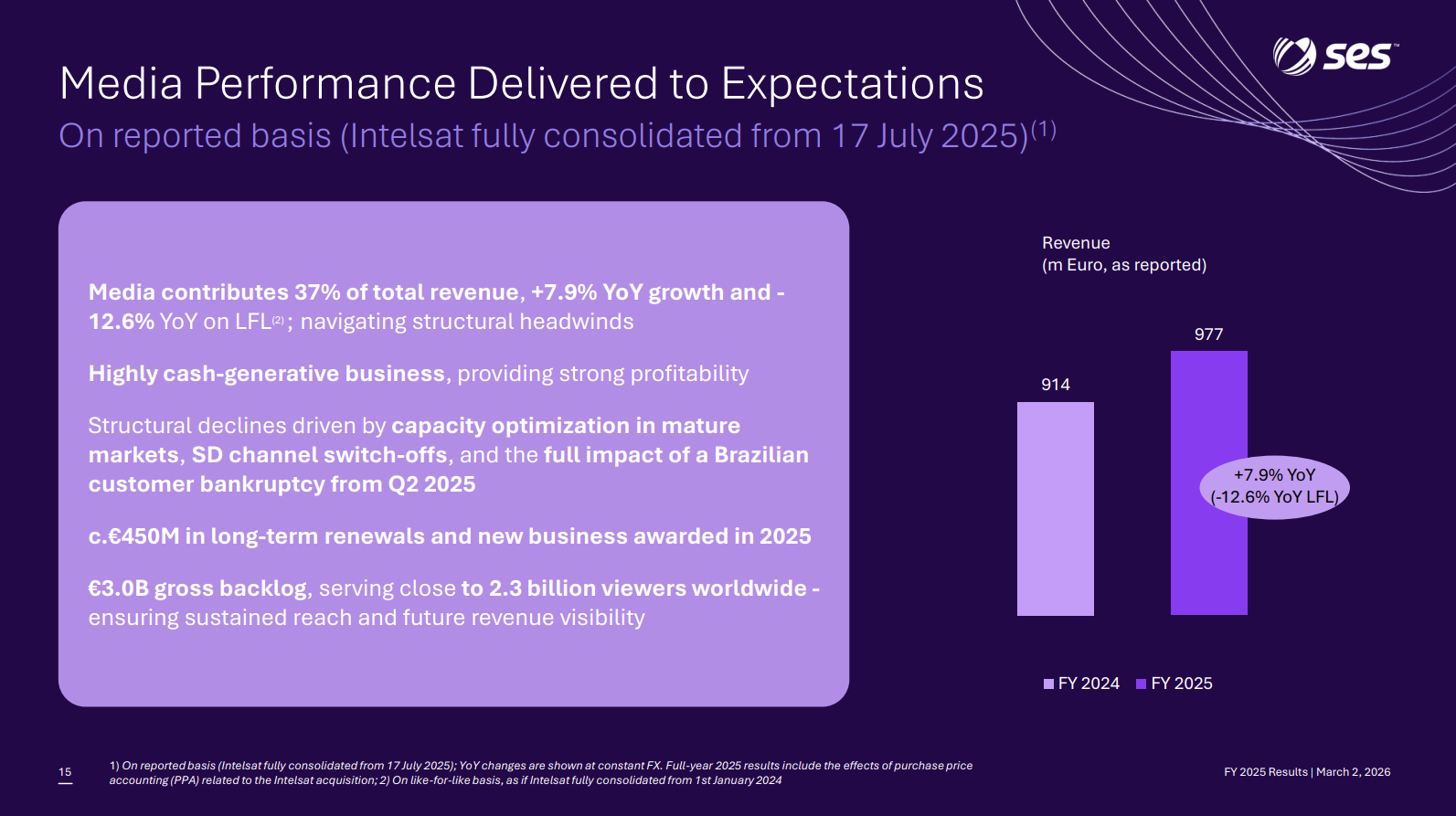 SES offentliggjorde 2025-rapporten, og at dømme ud fra markedsreaktionen svarede den nogenlunde til forventningerne. Jeg kopierer lige nogle hurtige nedslag her i frokostpausen; for mit eget vedkommende mangler jeg stadig at overveje, hvordan man værdiansætter en såkaldt “fremtidssektor”-virksomhed, der guider til nulvækst for indeværende år (selvom de ganske vist bygger forventninger op til de kommende år). Cash flowet er dog på den positive side, og spareprogrammet er i god gænge, hvilket betyder, at udbytteafkastet ved den nuværende kurs er solide 7,5 %. Bemærk, at integrationen af Intelsat har medført uorganisk vækst i dette års rapporterede tal.