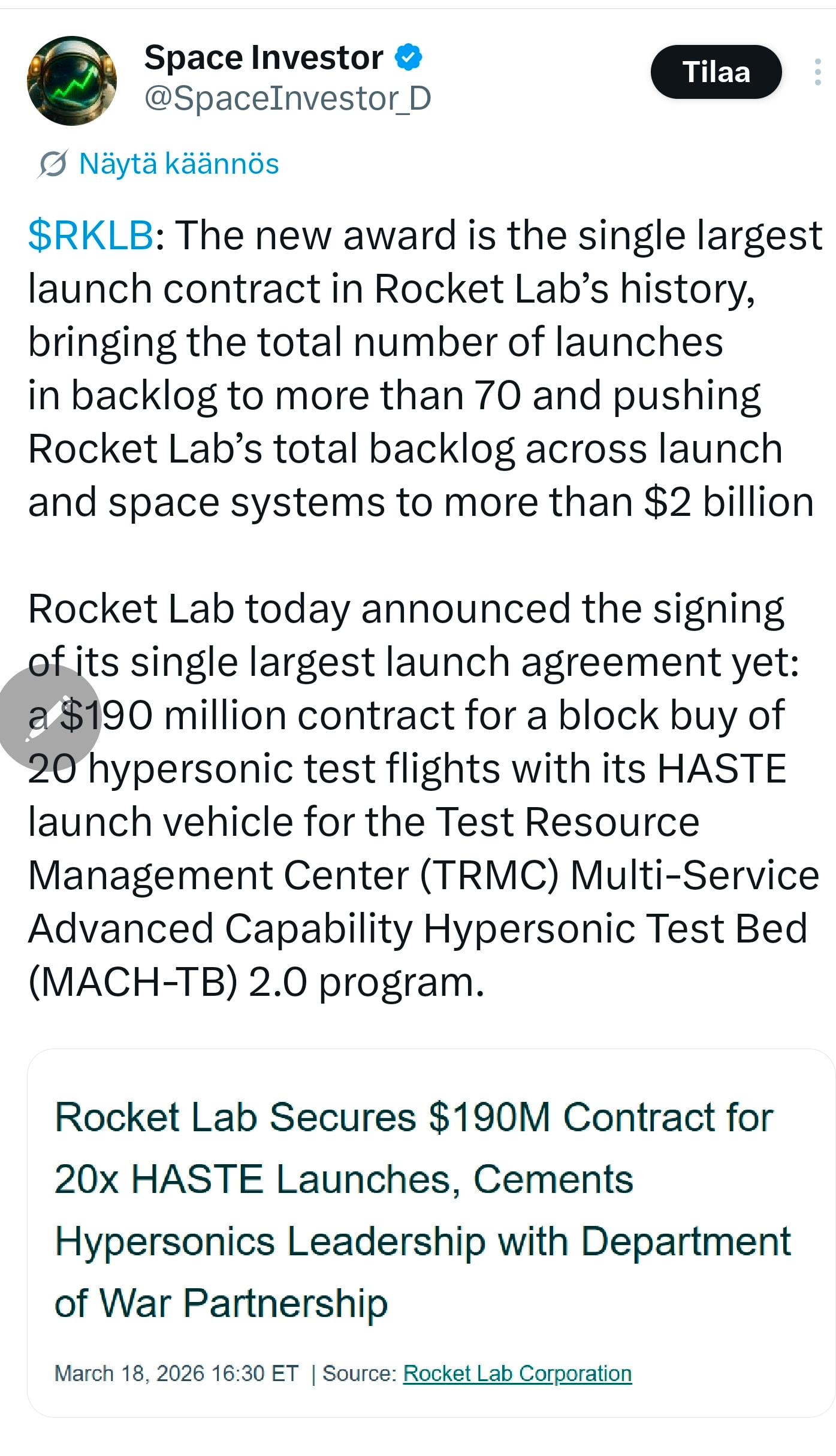 Omkring 30 % af RL’s omsætning kommer fra selve opsendelsen, resten fra space systems. Ganske fint. Jeg har været aktionær i et stykke tid, og det er virkelig et kvalitetsselskab.
