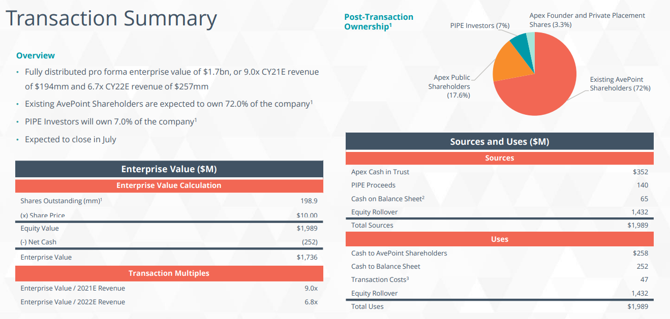 AvePoint listautui Nasdaqiin kesäkuun lopussa SPAC-mergerin kautta, yhdessä Apex Technology Acquisition Company (APXT) kanssa. Alkuperäisenä ajatuksena syksyllä 2020 oli listautua perinteisen IPOn kautta, mutta SPACin kautta saatiin hyvää verkostoitumista Jeff Epsteinin ja muun sponsoriryhmän kautta. Lisäksi nopeampi ja vaivattomampi prosessi sekä taatumpi rahoitus epävarmassa markkinassa veti vaakakupin SPACin puoleen.