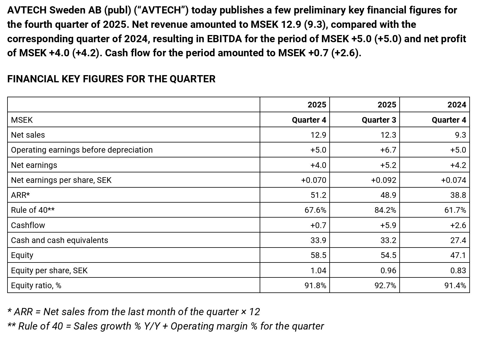 “2025 was our strongest year to date, with approximately 2,200 connected aircraft and record levels in both net sales and earnings. During the year, Aventus and ClearPath were deployed with new customers, and we took important steps in product development, including the ClearPath app, new features for On-Time performance, and improved collaboration between the cockpit and ground operations. For the first time, we are seeing that the market is ready for expanded collaboration between airlines and air traffic control. During the autumn, we initiated the sharing of real-time data with air traffic controllers, and the initial results are very promising and further strengthen customer value. With strengthened organization, solid profitability, and a pipeline of customers in testing phases, we enter 2026 with strong conditions for continued growth. At the same time, we note longer decisionmaking processes among some customers in today’s more uncertain global environment. During 2026, we also expect new and expanded strategic partnerships that will enable new products and higher value for AVTECHs customers,” said David Rytter, CEO. “Full-year 2025 represents our strongest performance to date, and we are also experiencing growing interest in AVTECHs products. A Rule of 40 of 67.6 precent reflects a healthy balance between strong growth and profitability. The strengthened earnings development provides room for further broadening of the product portfolio.”, said Ingvar Zöögling, Chairman of the Board