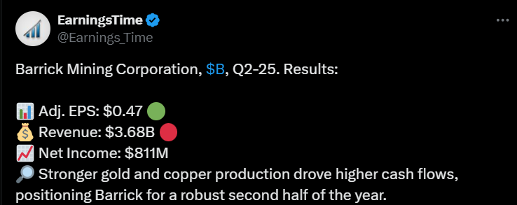 Barrick reported strong Q2 results, driven by increased production, decreased costs, and record-high gold prices.