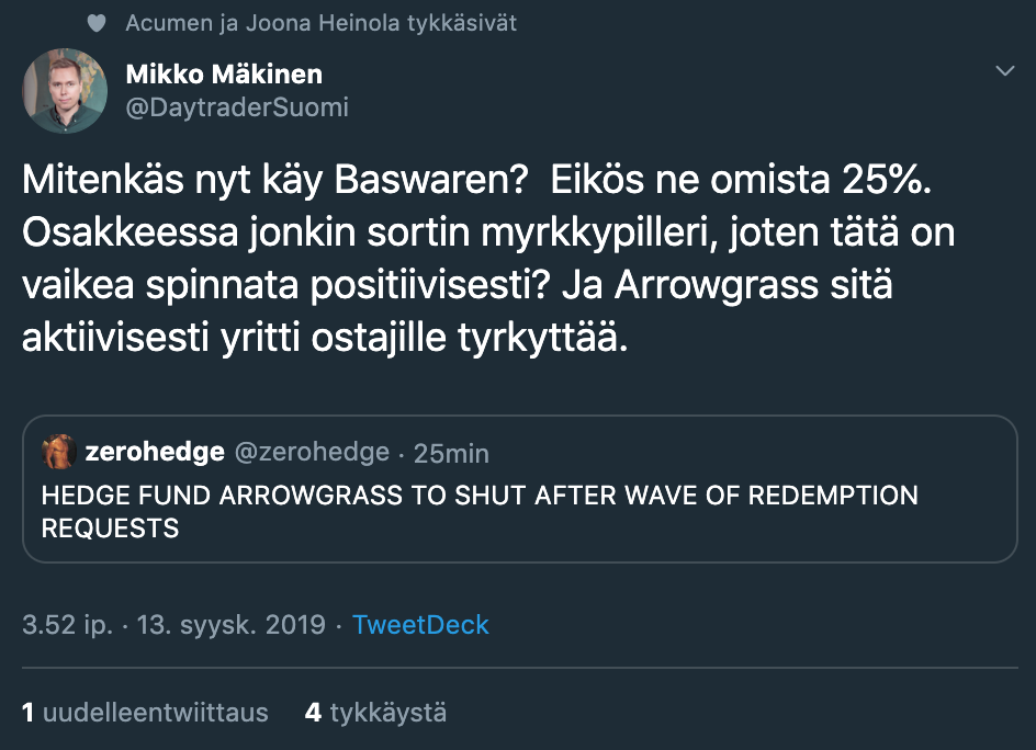 Ostin tuossa 18 euron pinnasta erän baswarea kun ajattelin että osakkeessa on hinnoiteltu todella paljon huonoa sisään. Kuitenkin johto on vaihdettu ja kannattavuus oli tarkoitus saada 2020 positiiviseksi. Oletan, että tämä saattaisi johtaa kurssin vahvistumiseen.