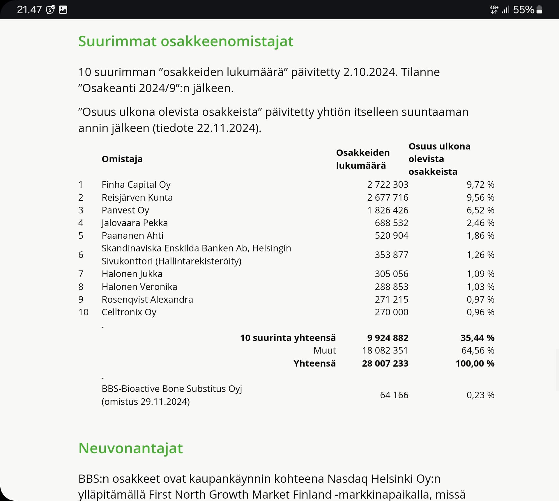 I’ve been thinking it’s either an exit or a partnership agreement and an offering. If an exit is on the table, will ConAlliance apparently organize a tender? What kind of exit price might there be for the BBS package? Let’s add a price of 60 million, or 2€ per share, just pulled out of a hat?? Can anyone ponder this? @Antti_Siltanen, is there any data or info on this?
