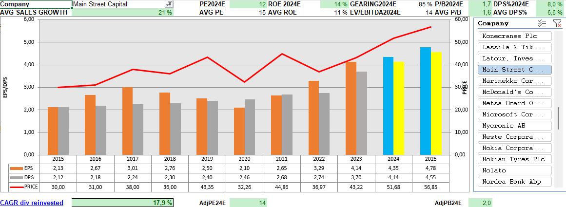 Minun suosikkini näistä on Main Street Capital, joka maksaa melko hyvää osinkotuottoa joka kuukausi ja lisäksi vielä muutaman ylimääräisen vuodessa. On tehnyt myös jo pitkään hyvää tulosta.