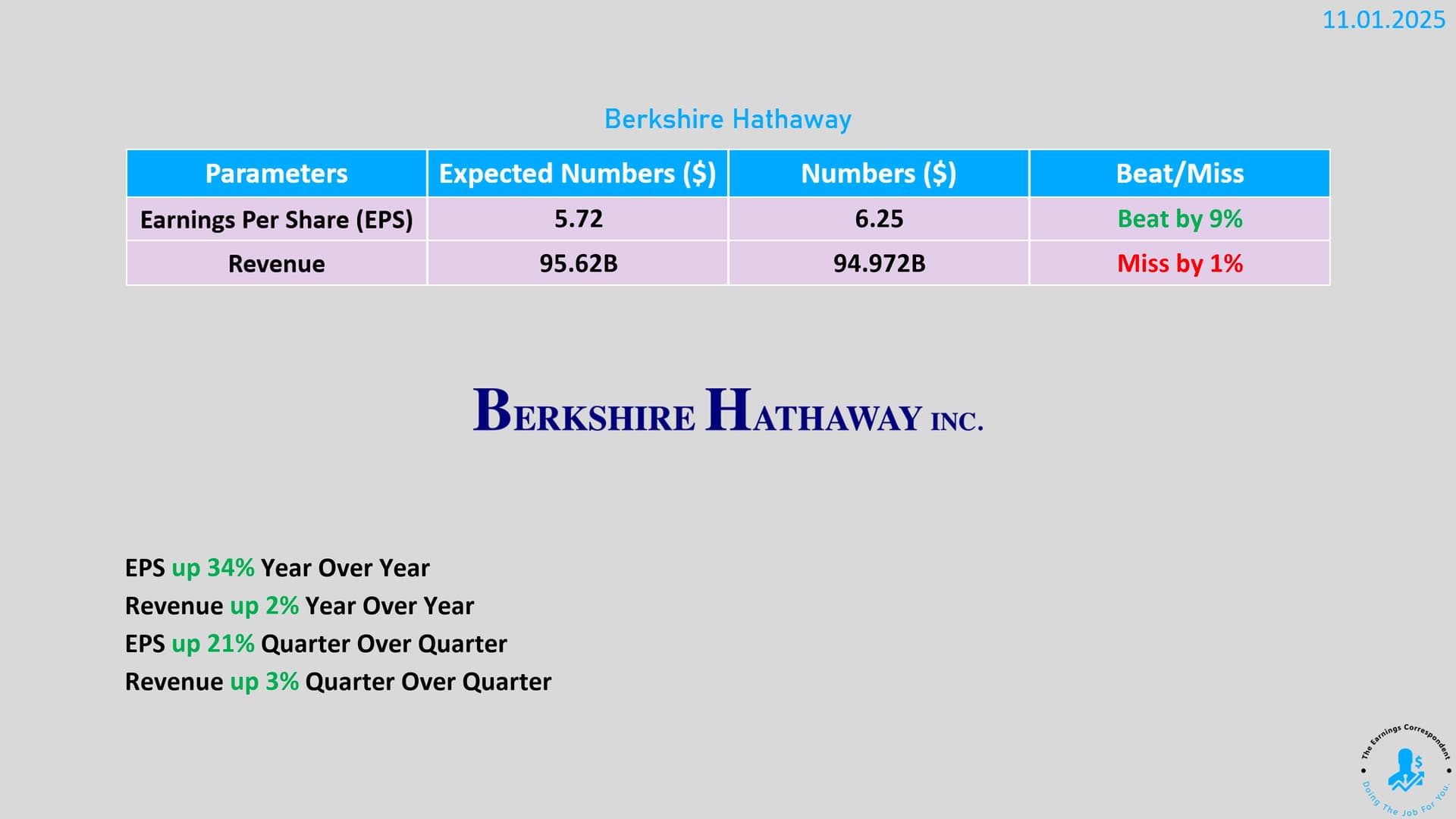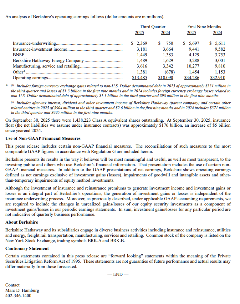 - Berkshire’s operating profit generated from the conglomerate’s wholly owned businesses including insurance and railroads jumped 34% year over year to $13.485 billion in the third quarter.