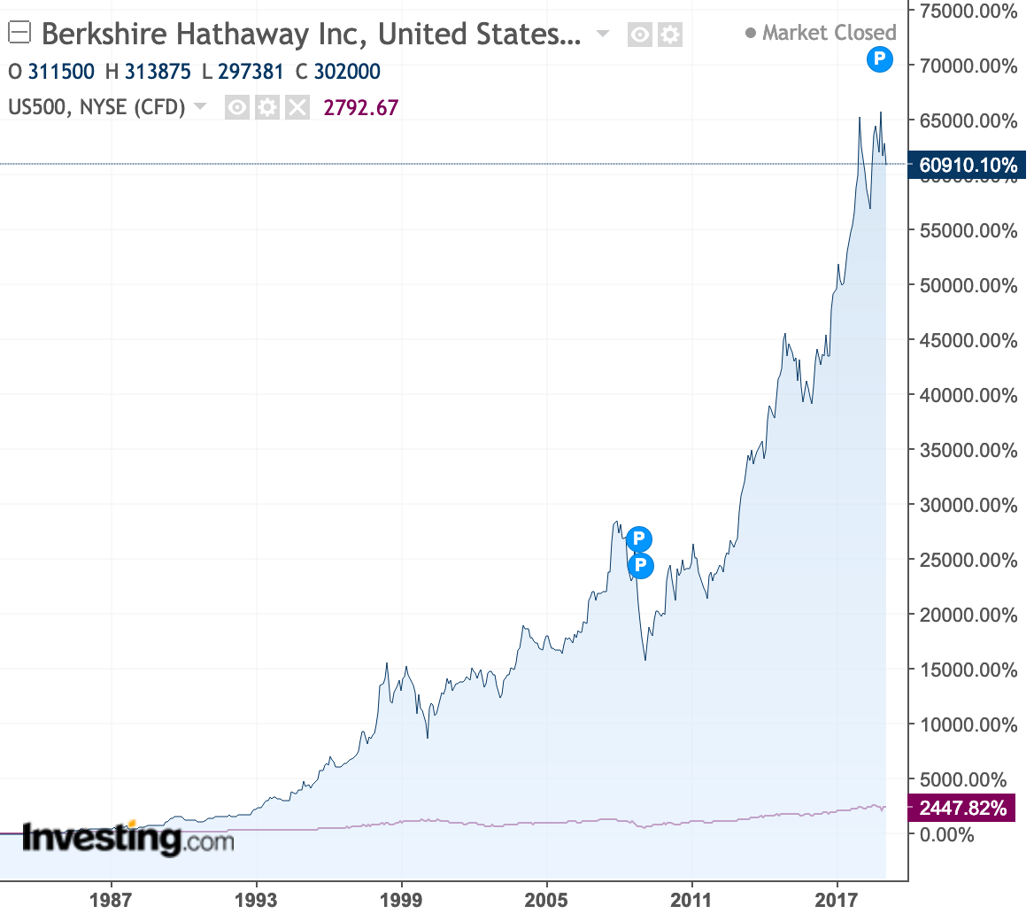 Berkshire Hathaway on siis yhden maailman menestyneimmän sijoittajan, Warren Buffettin, luotsaama sijoitusyhtiö. Yhtiön juuret juontavat tekstiilialaan ja 1800-luvulle asti, mutta Buffett tuli kuvioihin vuonna 1962 ja lopulta nurkkasi koko yhtiön itselleen. Ironisesti itse Berkshire Hathawayn ostos oli Buffettin mukaan hänen uransa huonoimpia, mutta samalla taantuvasta tekstiiliyhtiöstä hän rakensi sijoitusimperiumin joka laajentui vakuutusbisnekseen ja siitä saatavan ns. “floatin” turvin käytännössä kaikille aloille. Osakkeen arvo on noussut vuosina 1965–2018 keskimäärin 20,5 %, kun SP500 on noussut vastaavalla ajanjaksolla 9,7 %: sijoitettu 1000 dollaria vuonna 1964 olisi nyt noin 24 miljoonaa.