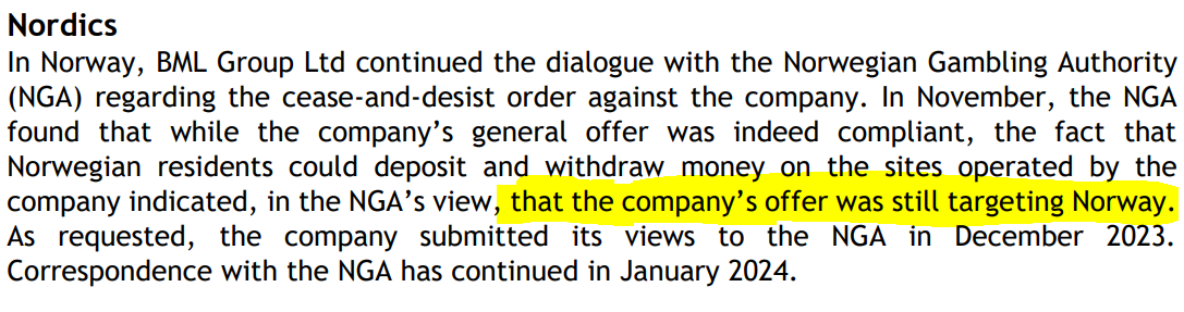 Viime vuoden Q4-luvuissa oli FIFA World Cup mukana, mutta tämä liittyy todennäköisesti Norjan toimintoihin. Norjasta poistuttiin 2vk ennen Q3 joten nyt nähtiin täysi efekti. Positiivista oli kuulla että Betsson käy keskusteluja Norjan viranomaisten kanssa. Pyyhettä ei olla kuitenkaan heitetty kehään koska raportissa ja puhelussa ei puhuttu Norjan exitistä.
