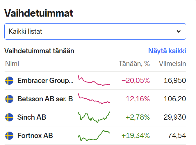 Tukholman pörssin vaihdosta päätellen kyllä Betssonin osake kiinnostaa. Jos nyt oikein tulkitsin niin päivän toiseksi vaihdetuin. Joskus välillä, tai aina tuntuu, että olen aika yksin tuon omistukseni kanssa, kun näitä palstoja seuraa.