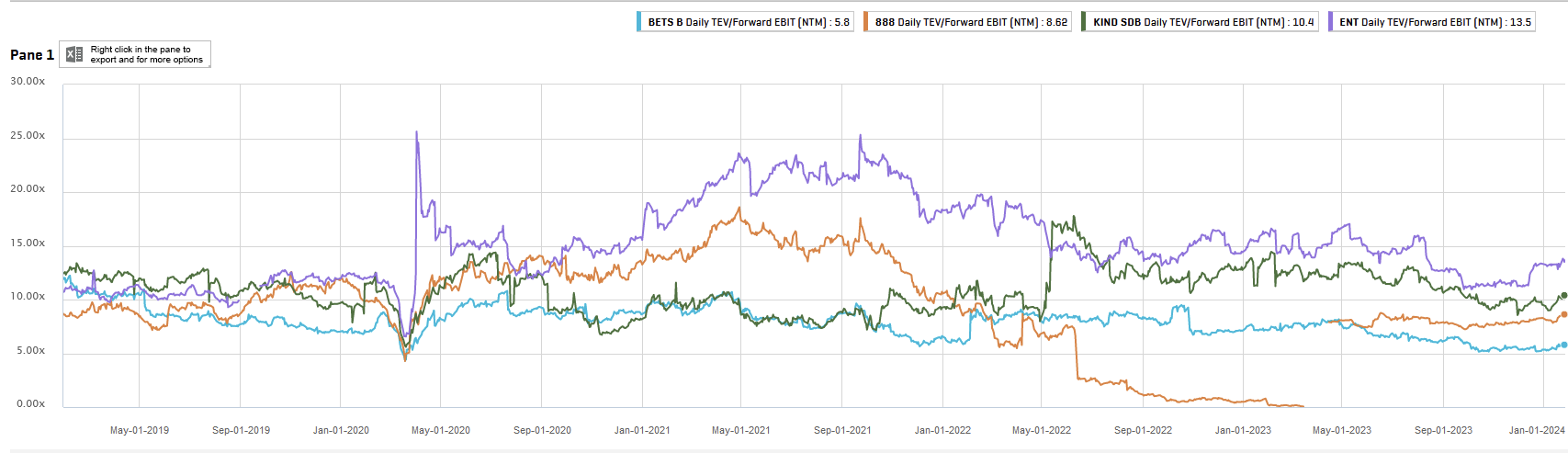 Liitteenä 5v aikasarja lähimpien verrokkien NTM (next twelwe months) EV/EBIT kertoimesta. EV/EBIT siksi, että tämä kerroin ei teoriassa ole riippuvainen yhtiön velkaisuudesta vs. P/E. Betsson on nettovelaton.