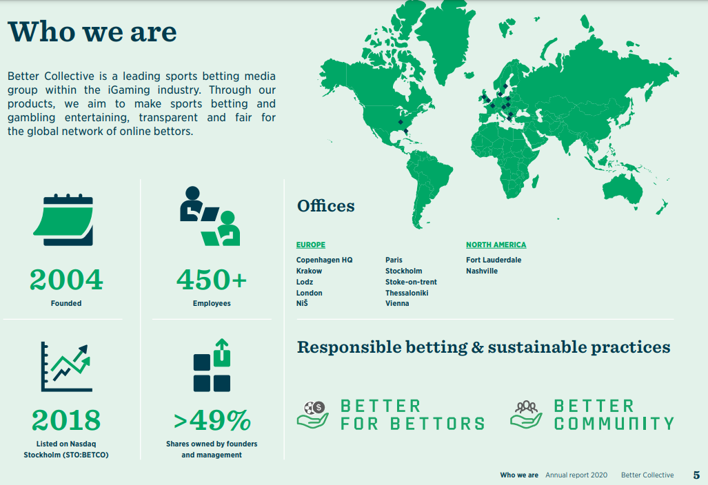 Better Collectiven siemen kylvettiin vuonna 2002, kun kaksi kaverusta päätti perustaa urheiluvedonlyöntiin keskittyvän nettisivuston. Sivuston saadessa suosiota, päättivät kaverukset perustaa Better Collective-nimisen yrityksen vuonna 2004. Tänä päivänä Better Collective näyttää tältä: