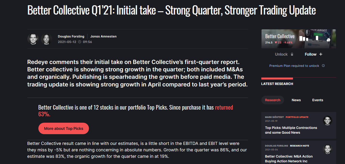 Yhtiö teki yrityskaupan äskettäin, jolla se hankki Action Network -yrityksen. Edit: Tässä yhteydessä tehtiin osakeanti, joka laski osakekurssia 237 → 210 sek. Lisäksi kurssi oli ollut vain muutama viikko aiemmin 268 sek.