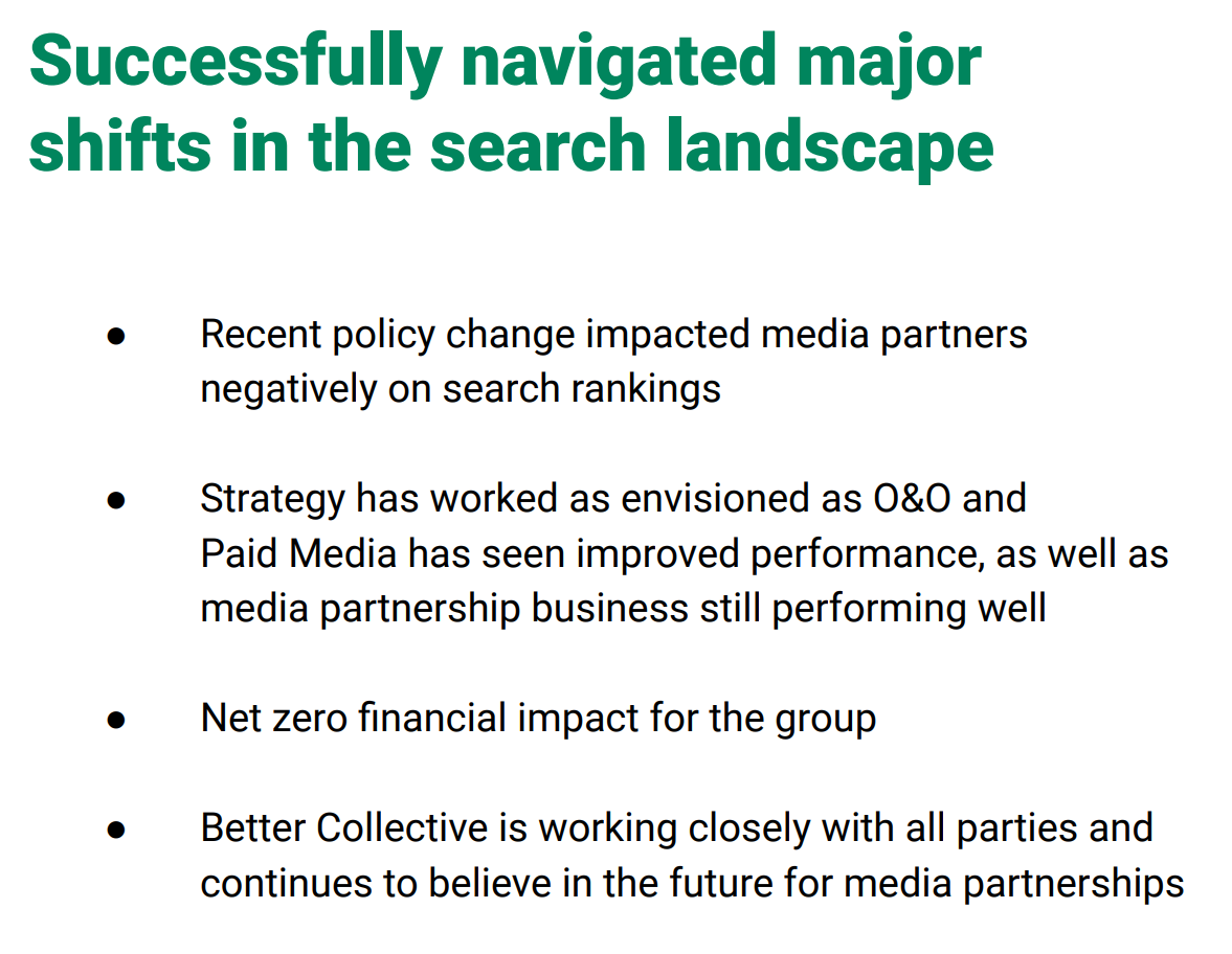 On May 5, Google activated a new policy focusing on third-party content across a variety of commercial categories. This impacted the rankings and thereby audience to some of Better Collective’s media partnerships. The owned and operated sports media portfolio has made up for the decreased performance. Since Q2, Better Collective has not experienced more changes.