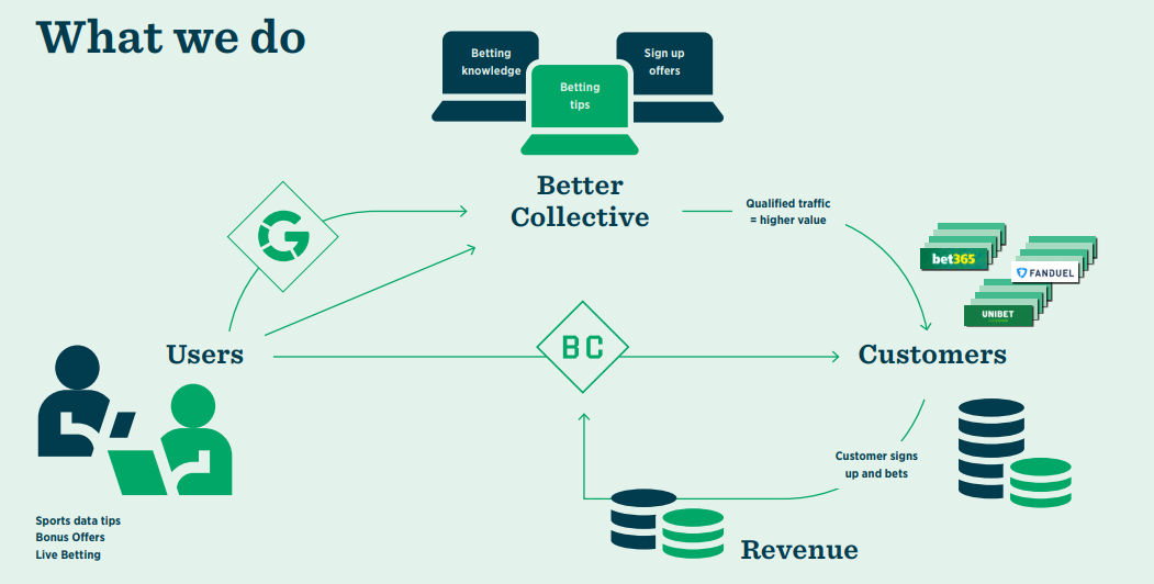 Hvad laver Better Collective så? Virksomheden er en førende medievirksomhed med fokus på sportsvæddemål, hvis mission er at forbinde spillere og operatører. Virksomheden ejer flere hjemmesider med fokus på emnet, såsom Bettingexpert, Betcompare, VegasInsider. Hjemmesiderne tilbyder spillere merværdi i form af uddannelse, fællesskab, væddemålstips og bonustilbud. Virksomhedens primære indtjeningsmodel er baseret på at formidle kunder til operatører som vist på billedet: