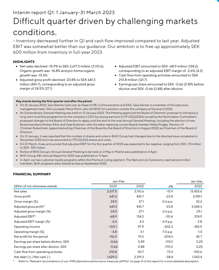 “We still have to finalise March but as we mentioned in the fourth quarter report, we expected a challenging 2023, especially the first half. Since then, the market has been weaker than we anticipated, with soft demand and high inventory levels putting pressure on prices and profitability. We remain focused on our actions to reduce both costs and inventory. Our liquidity position remains strong” says Gustaf Öhrn, President and CEO of BHG Group.