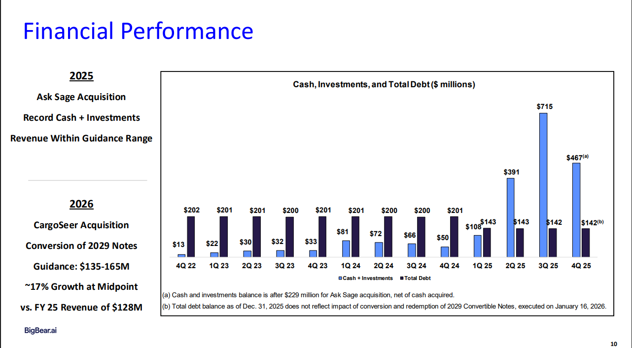 Taloudellisesti BigBear.ai on keskellä merkittävää uudelleenjärjestelyä ja muuta. Velkaa on onnistuttu vähentämään huomattavasti vaihtamalla velkakirjoja pidempään maturiteettiin (en tiedä tarkemmin näistä) ja muuntamalla osan osakkeiksi. Vahvemman taseen myötä kuitenkin yhtiöllä on rahkeita parempaan kasvuun, mutta porukka erityisesti kai tämän yhtiön osalta seuraa tuota kannattavuutta.