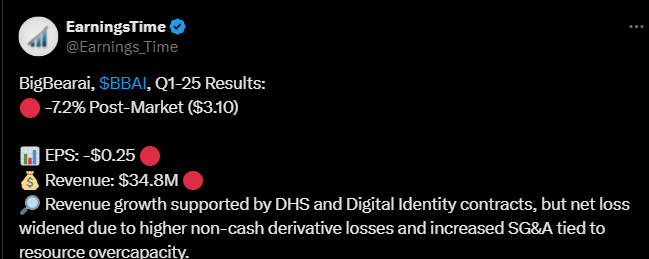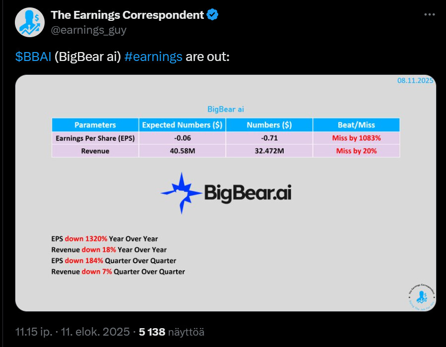 BigBear AI:n iikevaihto putosi 18 prosenttia vuoden takaisesta ja jäi muutenkin odotuksista, EPS heikkeni selvästi, lisäksi tämän vuoden liikevaihto-ohjeistusta laskettiin ja lisäksi EBITDA-ohjeistus peruttiin epävarmuuksien vuoksi.